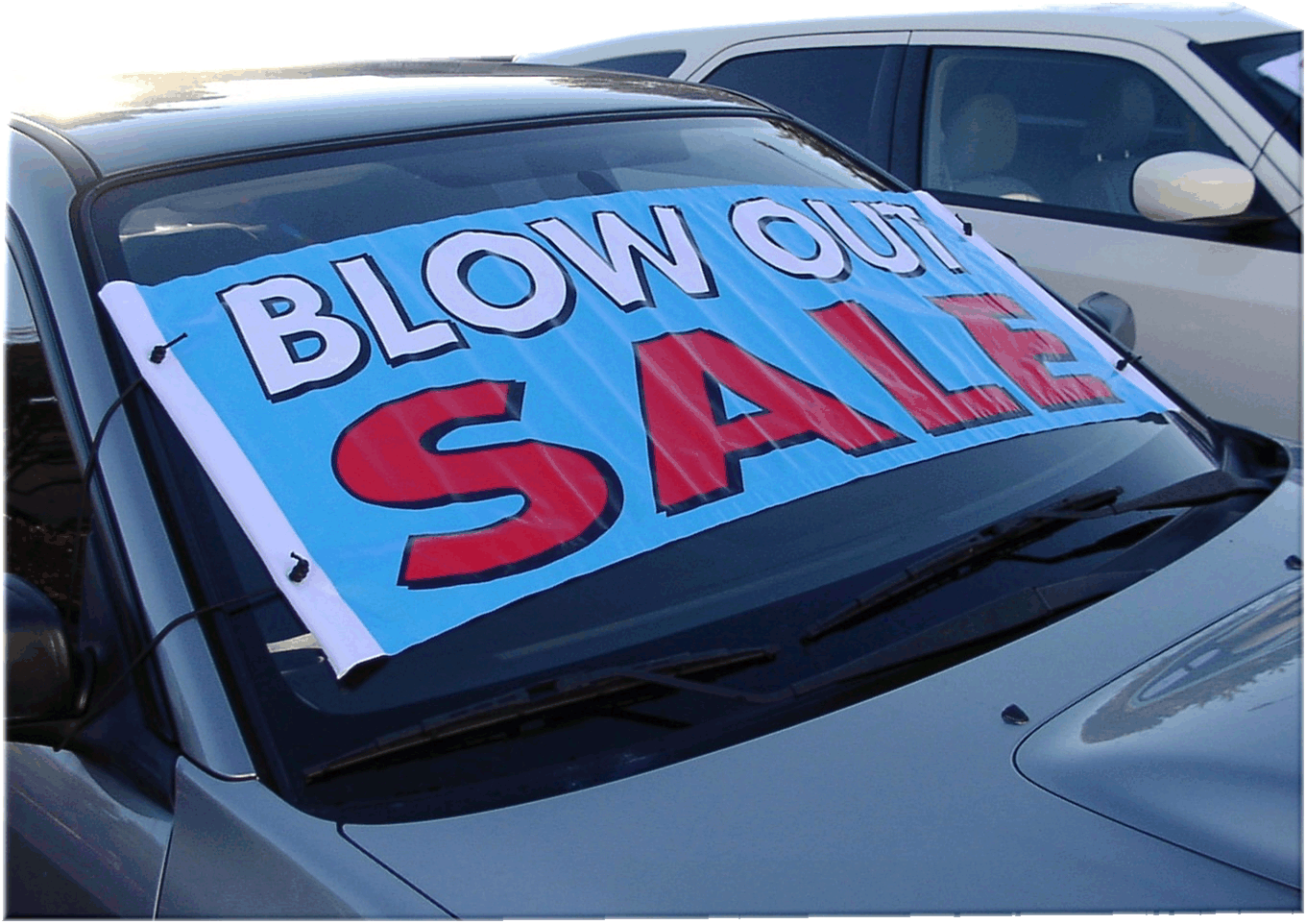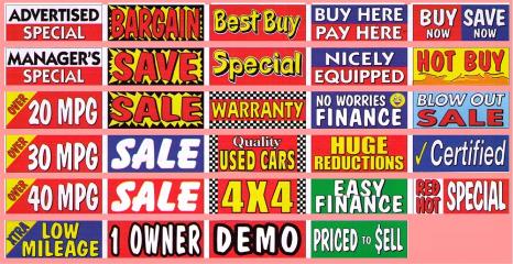 | Attaches to side mirrors using bungee cords 1 ft 8" tall x 4 ft 2" wide Made of heavy duty, reinforced, weatherized vinyl Reusable and easy to take off for test drives Printed on one side only |